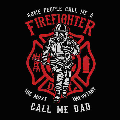 Mẫu thiết kế trên Sticker bán dịp Father’s Day dành cho niche những người cha làm nghề lính cứu hỏa (firefighter dad) với hình ảnh người lính cứu hỏa, sử dụng phông chữ và tông màu mạnh mẽ như đỏ, đen kết hợp